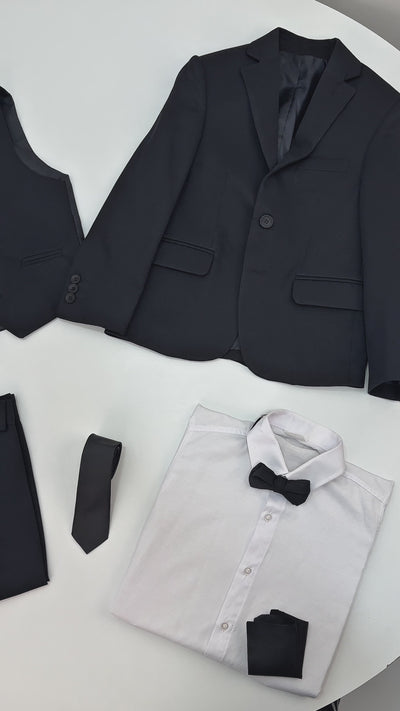 Das 7-teilige Set enthält: Sakko, Weste, weißes Baumwollhemd, Hose sowie passende Accessoires wie eine vorgebundene Fliege, Krawatte und Einstecktuch.