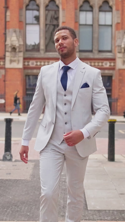 Erhältlich in Beige und Silber und abgerundet mit passenden Knöpfen, umfasst dieses 3-teilige Set eine Jacke, eine passende Weste und eine Hose. Ob für Hochzeiten, Geschäftsveranstaltungen, gesellschaftliche Zusammenkünfte oder Cocktailpartys – suchen Sie nicht weiter als diesen Anzug. Vervollständigen Sie Ihren Look mit einem Paar aus unserer Kollektion an Herrenlederschuhen.