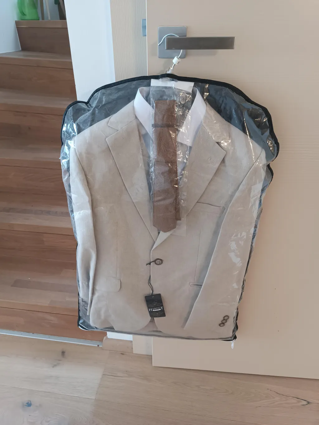 L'ensemble 8 pièces comprend une veste, un gilet, un pantalon, une chemise, une cravate, un nœud papillon, un mouchoir et une chaîne.