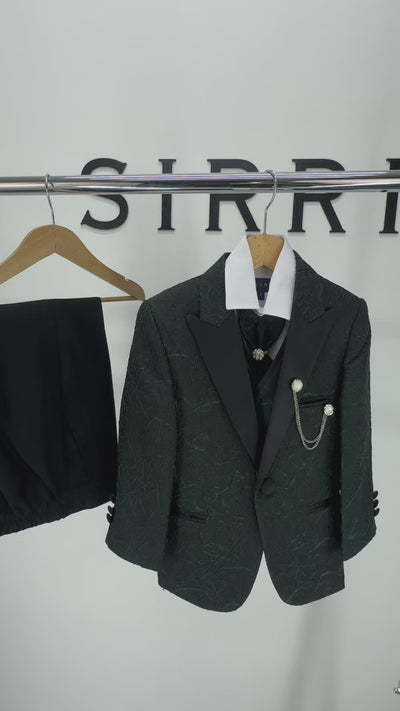 Give his formal wardrobe a modern upgrade with this luxurious boys’ 5-piece jacquard tuxedo set. Designed by Sirri with a striking black textured jacquard featuring a green sheen, this dinner suit delivers a sophisticated, regal look perfect for the most special occasions.