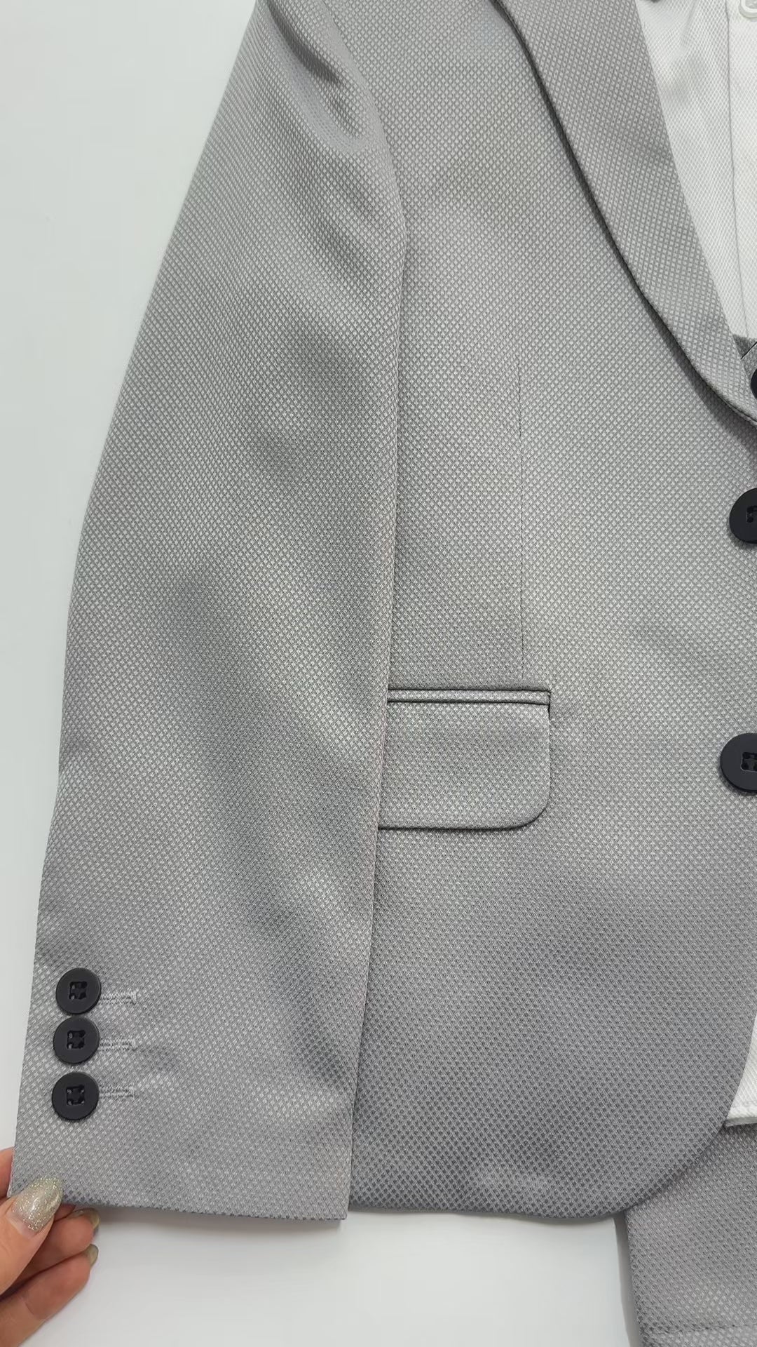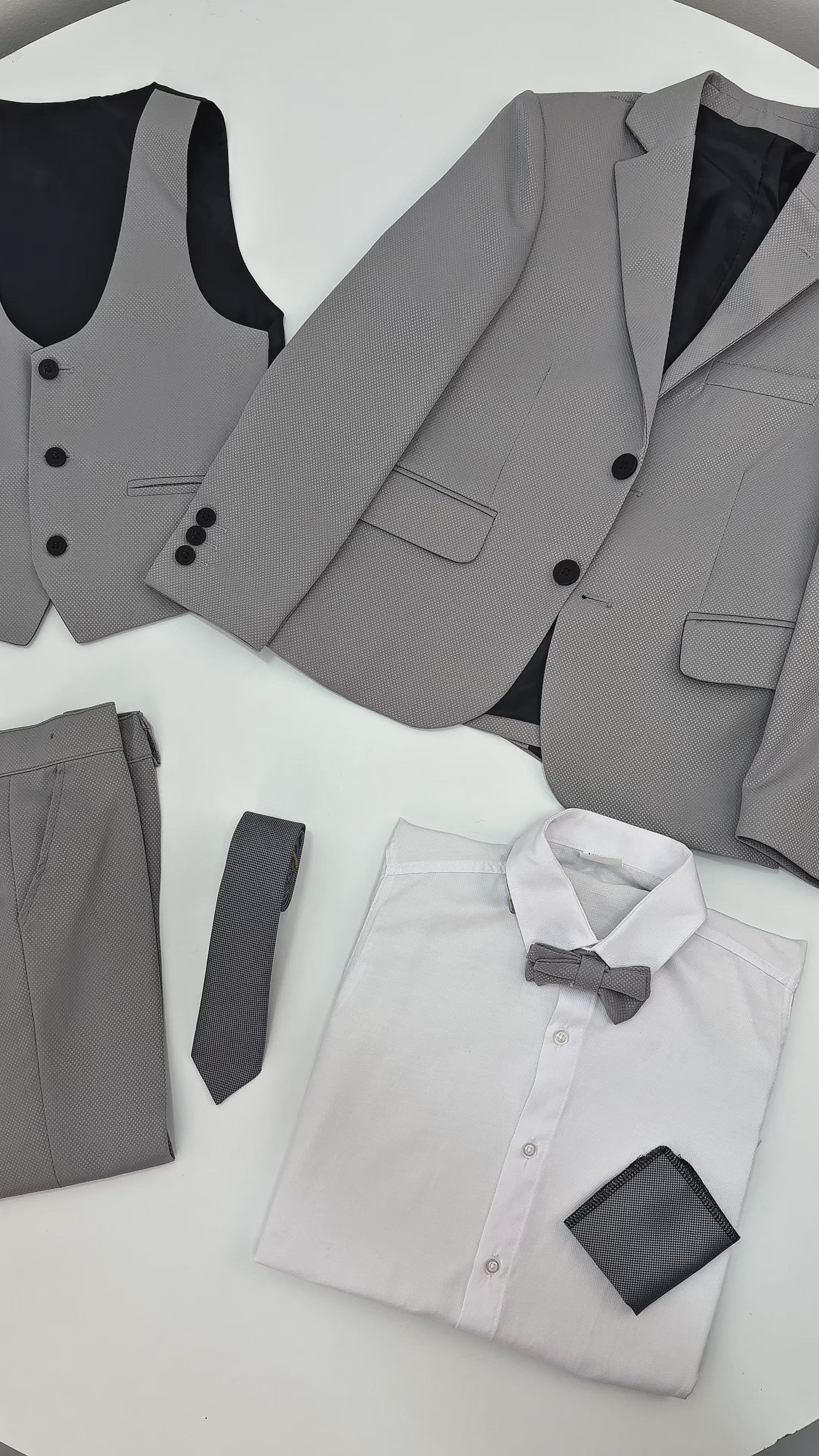 - The 7-piece set includes a jacket, a waistcoat, a white cotton shirt, trousers, and complementary suit accessories such as a pre-tied bow tie, necktie, and handkerchief.