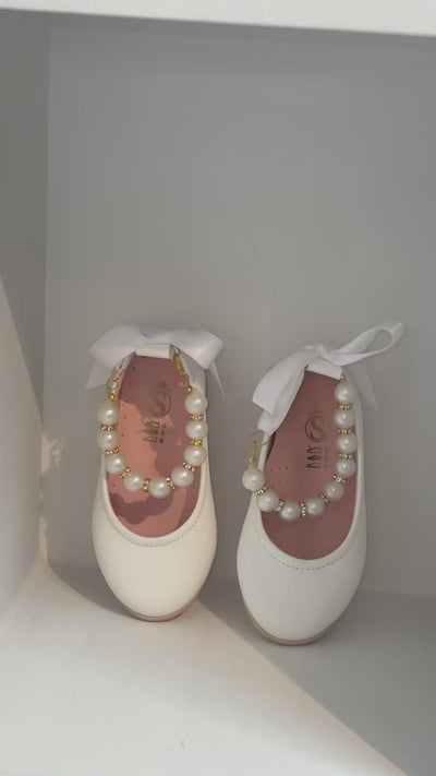Step into elegance with these charming Sirri Tean girls' flats, crafted with a smooth, chic finish, featuring a delicate pearl-embellished strap and a graceful ribbon tie at the ankle. The comfortable insole and flat heel ensure your little one can comfortably play or celebrate. Perfect for weddings, parties, or adding a touch of sophistication to any outfit.