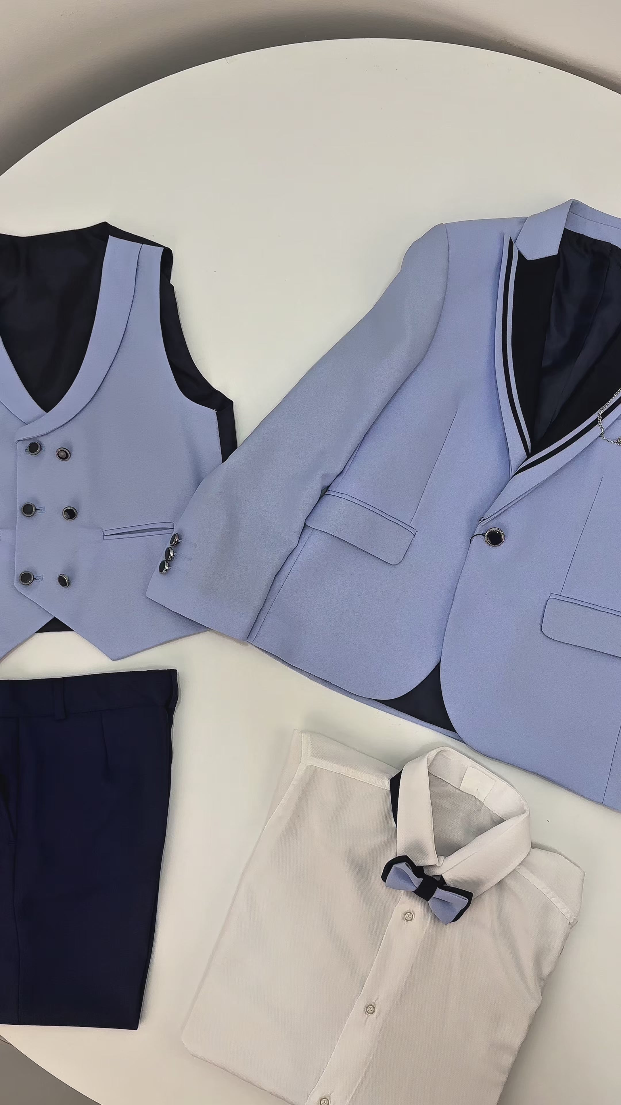 Available in classic, neutral shades—ivory, navy blue, blue, grey, and black—this 6-piece set includes a jacket, double-breasted waistcoat, shirt, trousers, matching bow tie, and detachable lapel pin chain. The trousers come with an unfinished hem and can be shortened to the desired length. The jacket is finished with a detachable collar that offers versatility, allowing it to be worn as a solid-coloured suit.