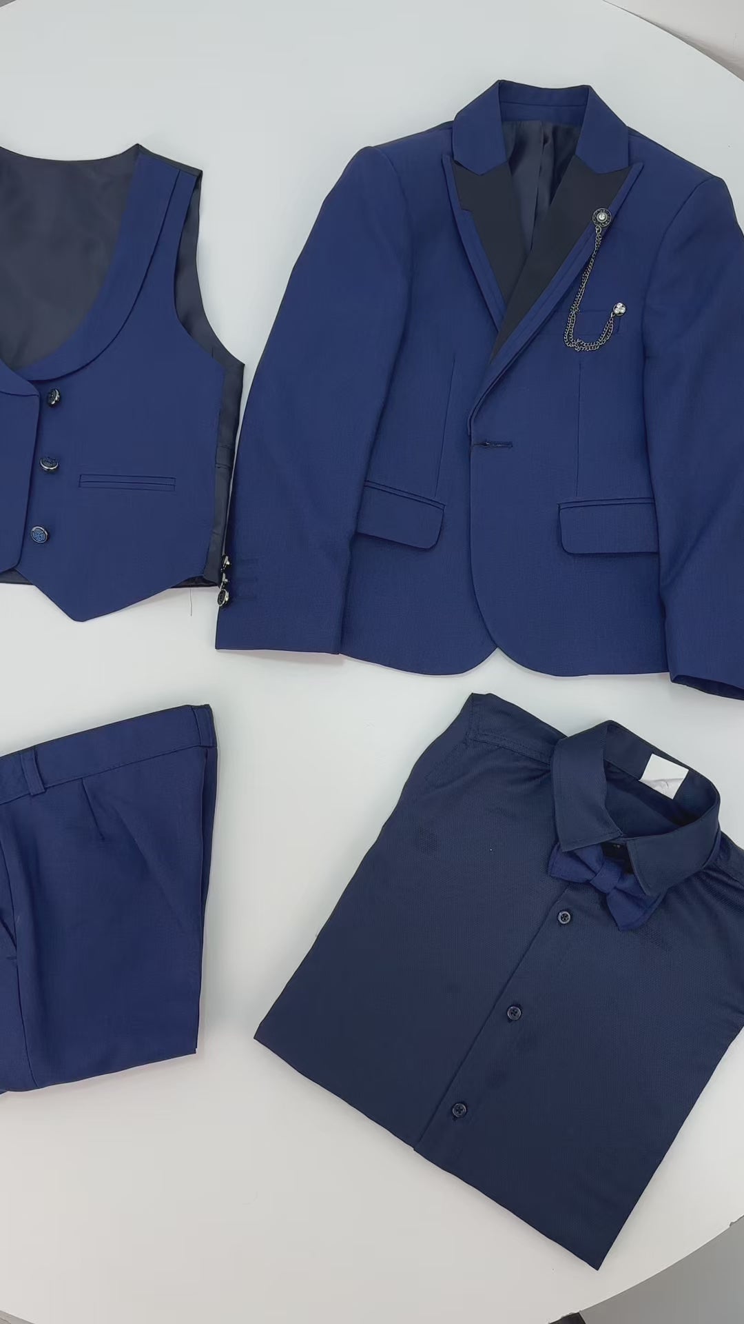 Available in classic, neutral shades—ivory, navy blue, blue, grey, and Navy—this 6-piece set includes a jacket, double-breasted waistcoat, shirt, trousers, matching bow tie, and detachable lapel pin chain. The trousers come with an unfinished hem and can be shortened to the desired length. The jacket is finished with a detachable collar that offers versatility, allowing it to be worn as a solid-coloured suit.